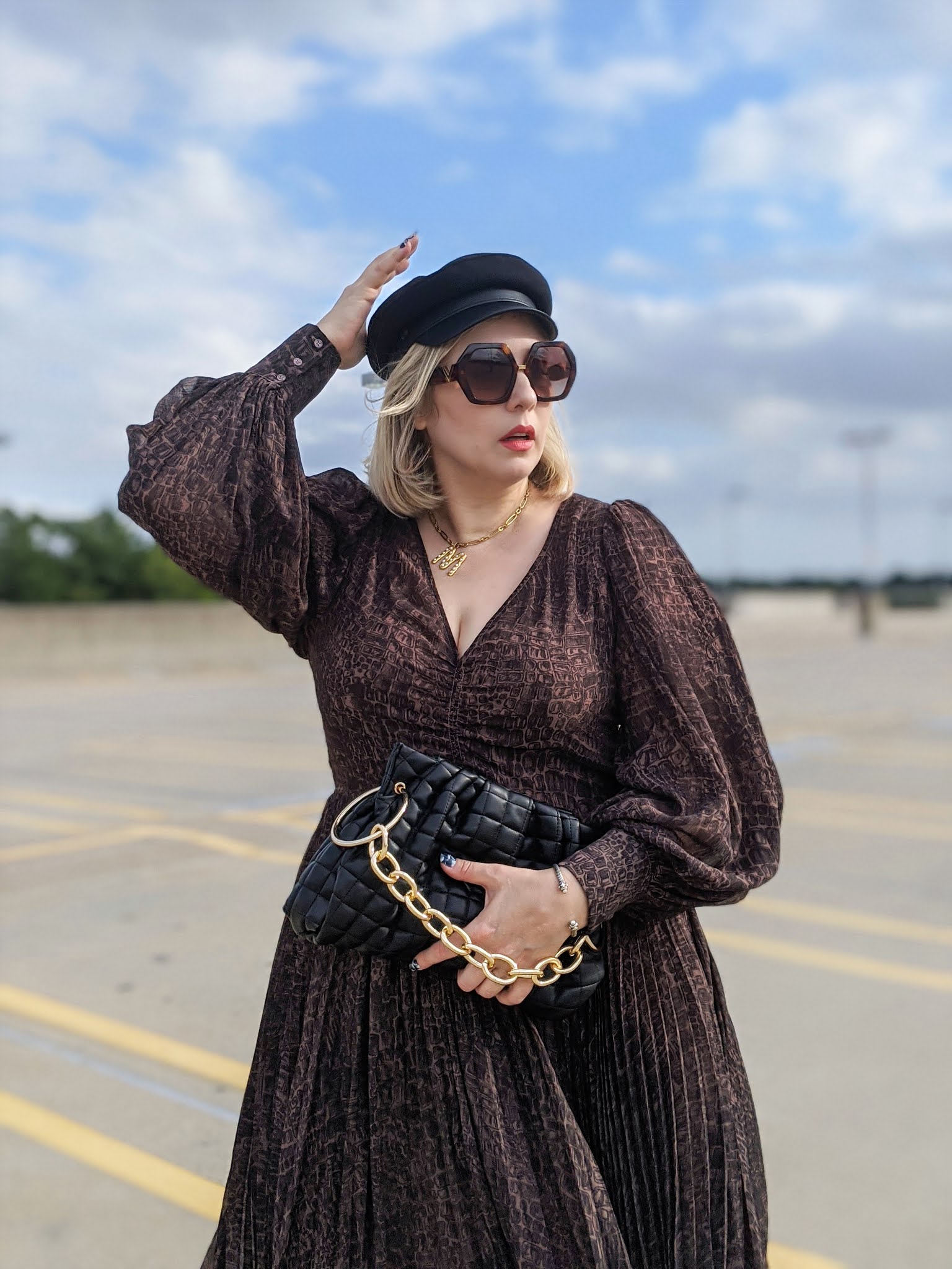 For my next look, it was all about this dress. As a dress girl, I usually focus my shopping on dresses (and coats) in shapes that will work for my curves. Because I'm short-waisted, I would have preferred a higher waistline but this one was workable. I know that my friend Greivy has this dress in blue and she belted hers. I also love a voluminous sleeve to cover the little extra I'm carrying on my upper arms. And if you were looking for a Bottega dupe, this quilted vegan bag from House of Want for under 100 bucks may be just what you need.